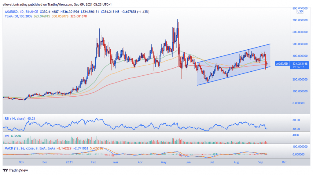 Of course, this week’s sharp declines have much less to do with Aave and more to do with Bitcoin’s (BTC/USD) launch as legal tender in El-Salvador. It appears that substantial longs offloaded positions built up ahead of the historic day into the wave of euphoric retail buying that had lifted BTC to $52,920, its highest price since May. The selling was fairly orderly until BTC lost the $50k threshold, at which stage, it cratered to $42,843 for an almost perfect $10,000 peak to trough slide. This sent shockwaves across the market, and many altcoins suffered severe drawdowns of over 50%. As a result, Aave followed the market lower. However, despite the losses, the outlook is still positive for now.