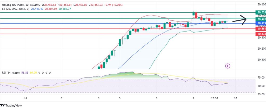 The Nasdaq 100 Index ended the day marginally up on Tuesday, closing the session at 20,453 points after hitting a new all-time high of 20,543 earlier in the day. The index has risen by 3.9 percent since the beginning of July, underlining a strong buying momentum amidst dovish-leaning Fed interest rate sentiment.