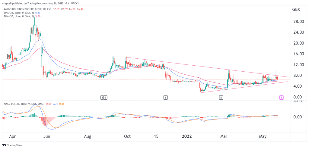The daily chart shows that the Amigo share price has been in a tight range in the past few weeks. The stock has formed a symmetrical triangle pattern that is shown in red. At the same time, the stock remains slightly above the 25-day and 50-day moving averages. In addition, the MACD has moved slightly above the neutral point.