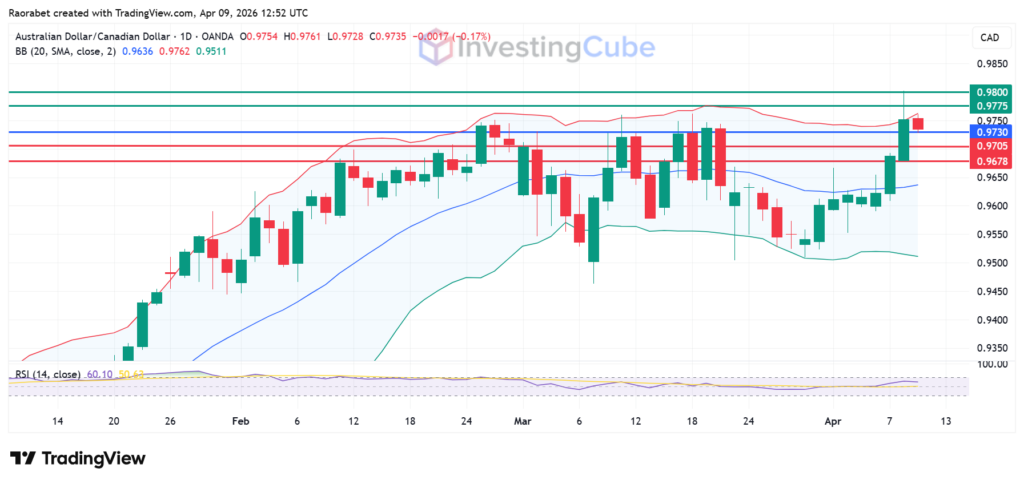 AUD/CAD FX pair on the daily chart with key levels of support and resistance on April 9, 2026. Created on TradingView