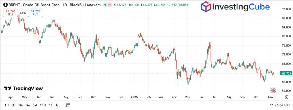 The Brent crude oil price edged higher to around $63.75 a barrel on Friday, stabilizing after a volatile week dominated by oversupply worries and weaker U.S. demand signals. Even with today’s modest recovery, the benchmark is still heading for a second consecutive weekly loss, underscoring how fragile sentiment remains across global energy markets.