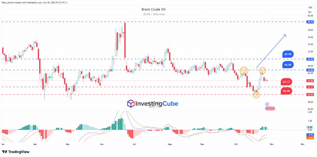 Brent crude oil started the day lower, trading around $63.80 under pressure from recent bearish trends. On the daily chart, the price is consolidating between a key resistance zone at $66.88-69.90 and a support area near $60.06.