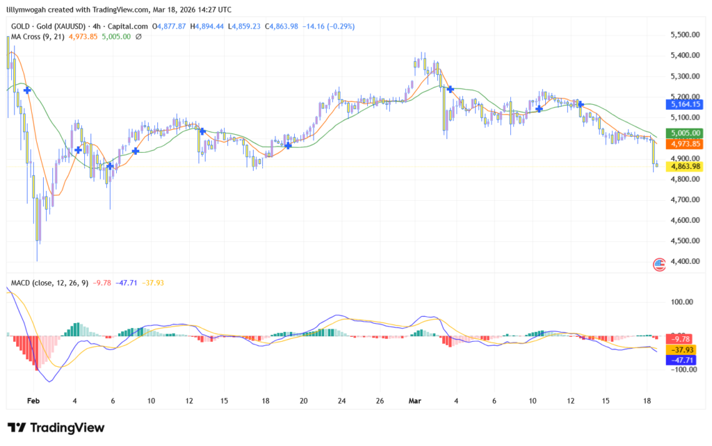 - Support: $4,850 – $4,881 This is the immediate floor. A sustained break below this liquidity zone could accelerate losses toward the rising 100-day SMA at $4,595.