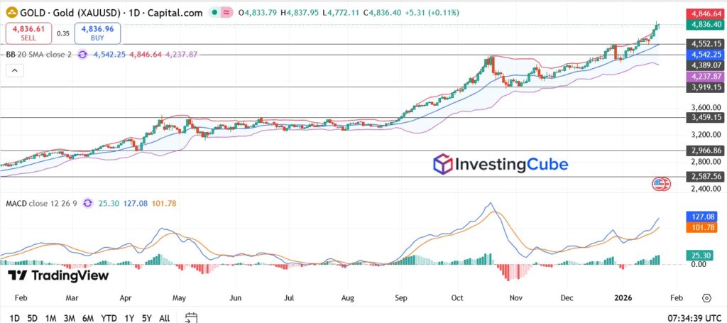 At the time of writing, spot gold is trading around $4,830–$4,840, holding firmly above the $4,800 breakout zone as buyers continue to defend recent highs.