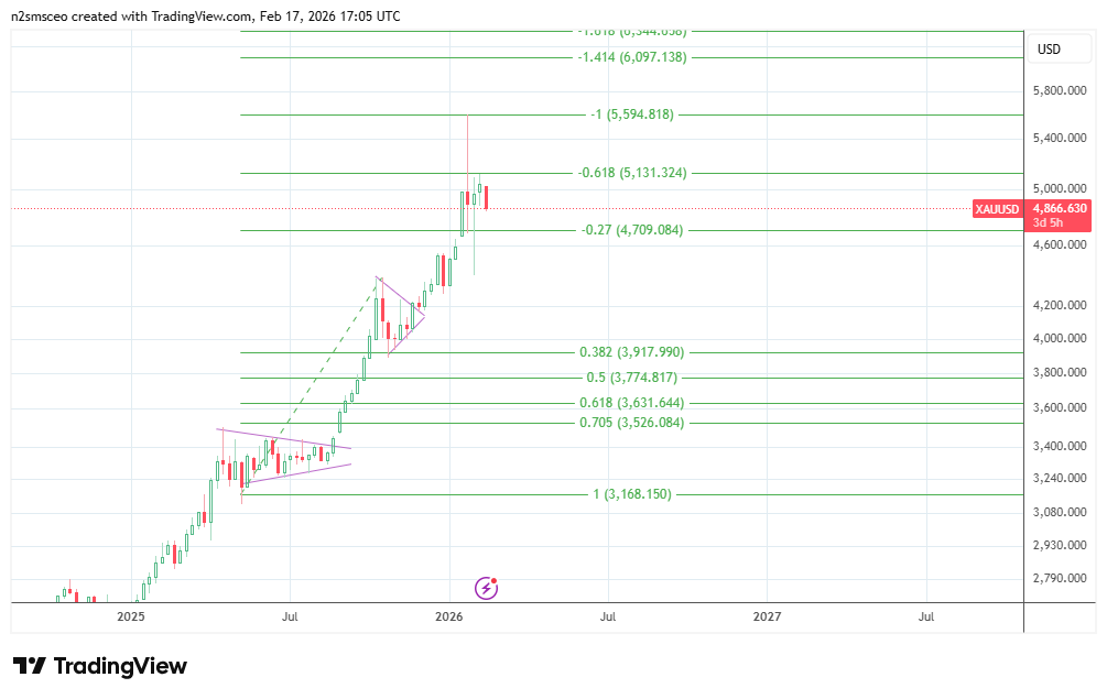 - Upper Resistance: 5594.81 (100% Fibonacci extension and 26 January 2026 high, which is the all-time high).