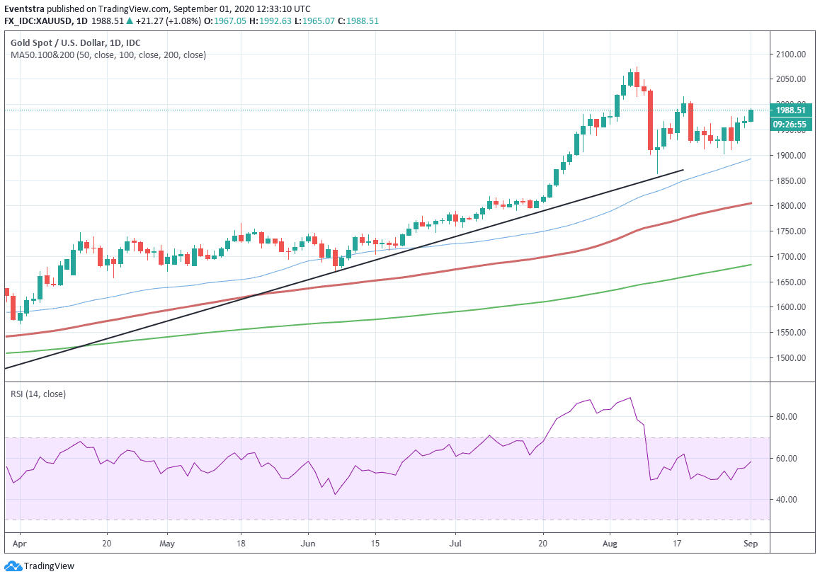 Gold price on the XAUUSD daily chart indicates that the yellow metal continues to trade in a range, bordered by 1980.74 to the north and 1918.68 to the south. Further upside in gold prices will put the ceiling of the range under pressure, especially if the Brexit feud between the EU and UK lingers. A break above the 1980.74 price level opens the door towards the 2008.04 target (18 August high and 38.2% Fibonacci retracement from the swing low of 15 July to the swing high of 7 August).