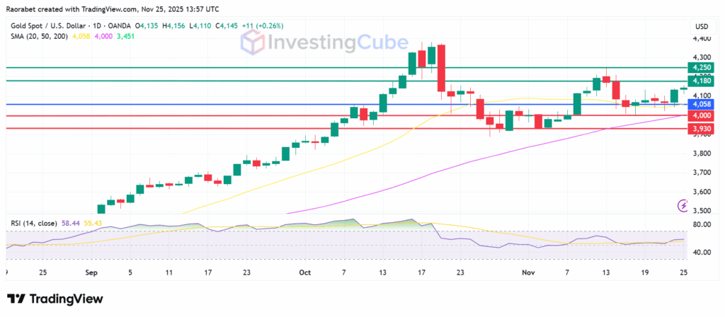 Gold price daily chart at the spot market as of November 25, 2025 with key support and resistance levels. Created on TradingView