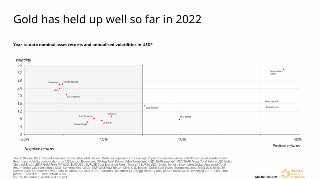 The Gold World Council chart shows that during the Russia-Ukraine war in 2022, gold performance generated positive returns while most major assets, such as the US equities and global bonds, recorded sharp losses.