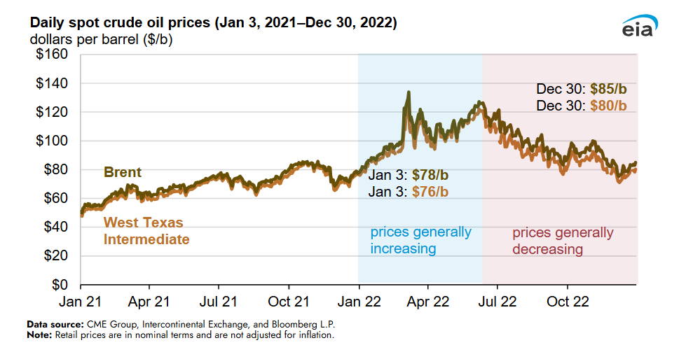 - Russia-Ukraine war in 2022: During this war, commodity prices jumped significantly. The front-month price of both Brent and West Texas Intermediate crude oil has increased to more than $100 per barrel.