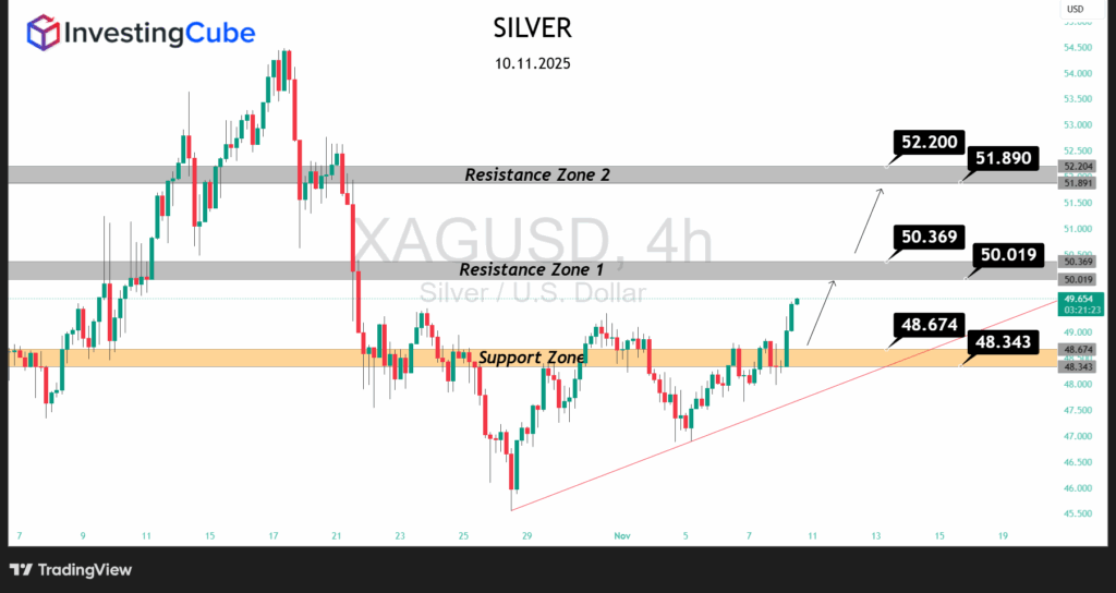 [InvestingCube, 10 November 2025] Silver (XAG/USD) continues to hover over the $49/oz level is it pulls off two days of wins due to traders, assessing the news regarding politics and trade coming out of the United States, as global risk moods improve with a Senate bill passed in the U.S to continue working towards a reopening of the government.