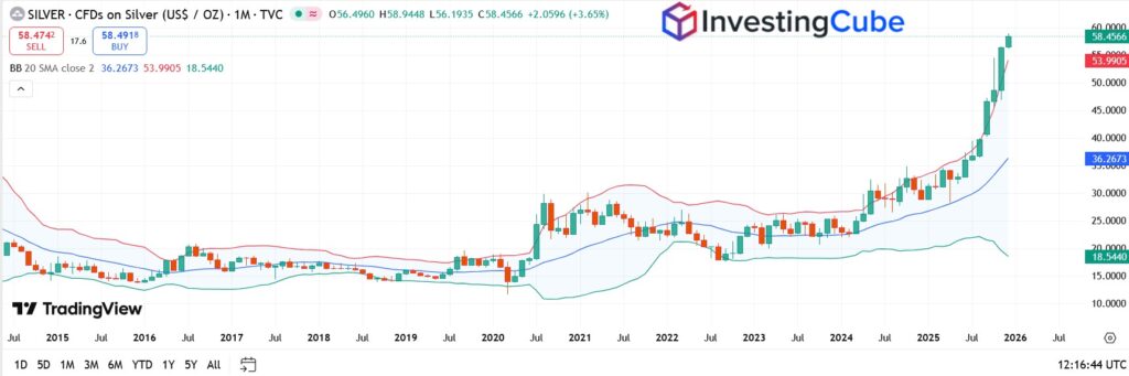 Silver pushed into Wednesday’s session still riding the extraordinary surge that has defined the last two weeks, with prices hovering near $58.45 and holding close to fresh multi-year highs. The metal has climbed at a pace that even seasoned traders acknowledge is rarely sustainable, rising more than 20% in under two weeks and extending far above its longer-term averages.