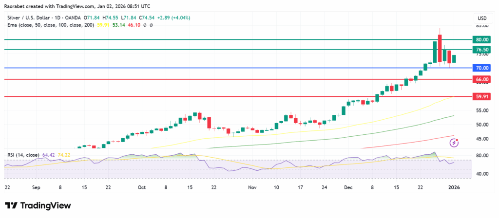 Silver price daily chart on January 2, 2026. Support and resistance levels created on TradingView