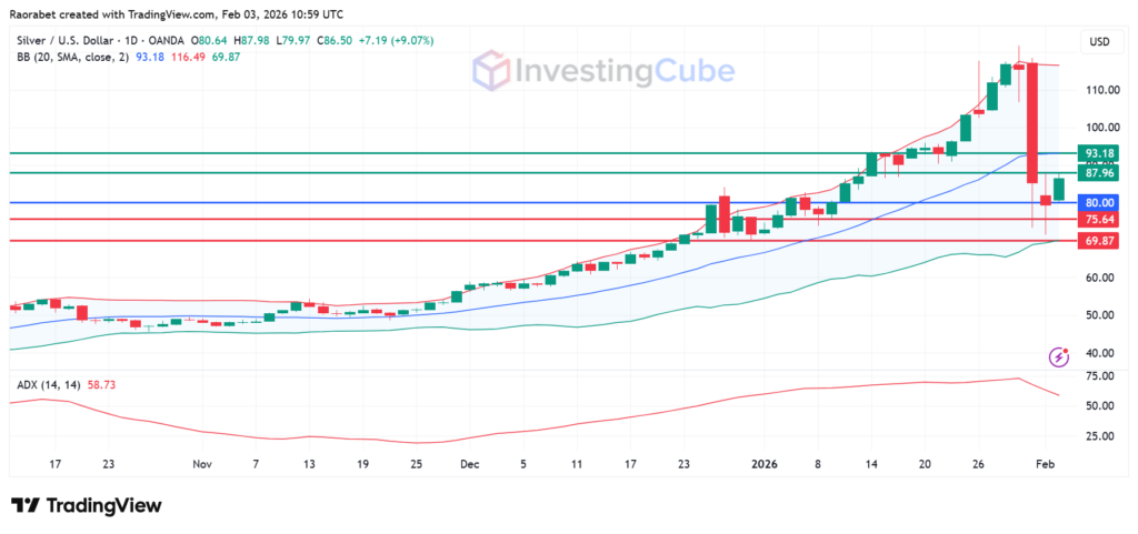 Silver price on the daily time frame with the main levels of resistance and support on February 3, 2026. Created on TradingView