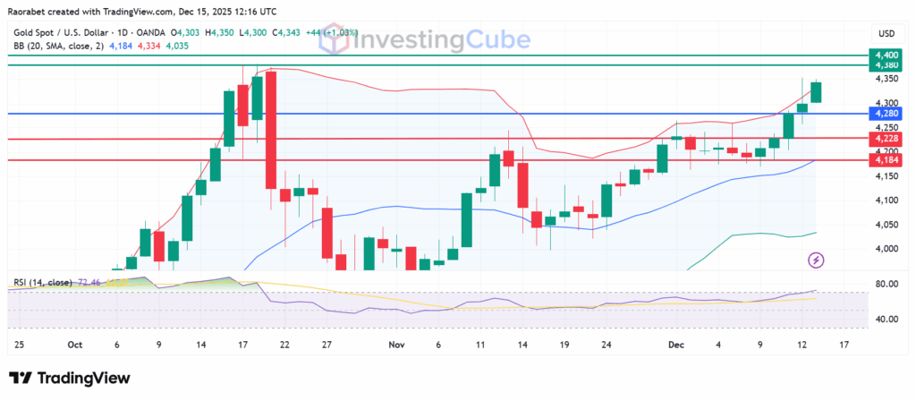 XAUUSD Relative Strength Index (RSI) is at 72, which means there is strong momentum that has driven it to overbought territory. There’s likely to be immediate resistance around the all-time high of $4,380 and $4,400. If gold breaks through these levels, it could rise to $4,800. However, if it falls below the middle Bollinger Band at $4,200, it might drop back down to $4,228. The upside narrative will be invalid if XAUUSD goes below that level and the pair could fall lower under increased selling pressure to find the next support at $4,184 per ounce.