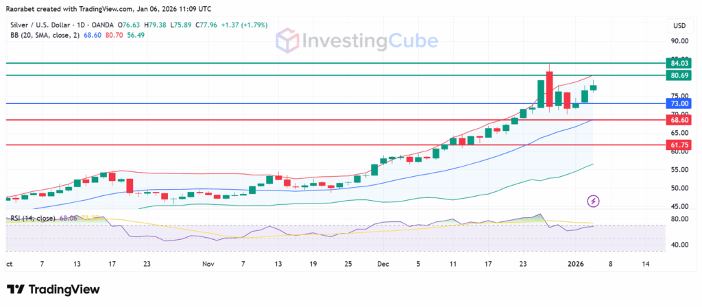 Silver is currently in a price discovery phase after breaking past the decade-long $50 resistance. The RSI is at 68, showing positive momentum without being overbought. The next resistance is at the upper Bollinger Band level of $80.69, with a clear path to retest all-time highs of $88 if the buying momentum continues. Breaching that mark could see it target the psychological $90 mark. On the downside, initial support is at the middle Bollinger Band at $68.60. If it falls below this, it could drop back to the $61.75 mark which is within the recent accumulation zone.