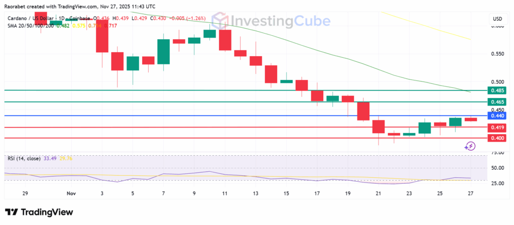ADA/USD daily chart on November 27, 2025 with support and resistance levels. Created on TradingView