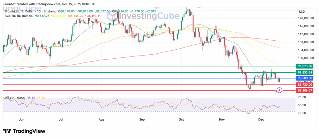 Bitcoin price daily chart on December 15, 2025 with 20,50 and 100 and 200-day SMA indicators and key support and resistance levels. Created on TradingView