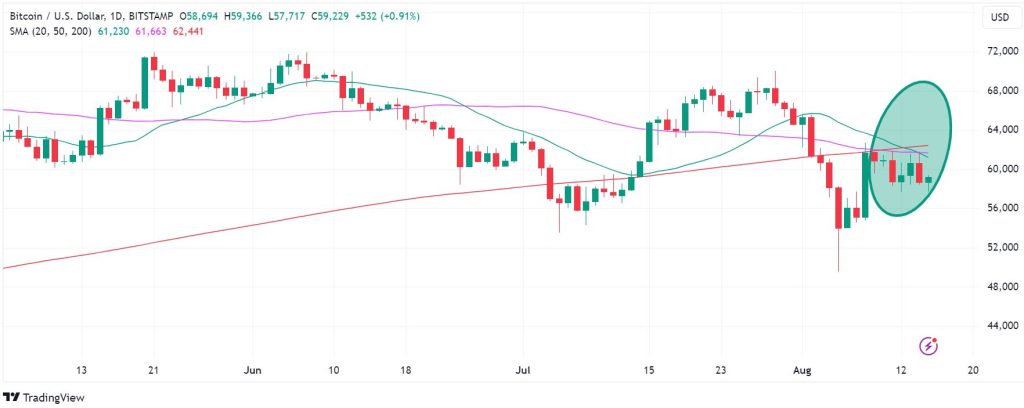 Bitcoin price slipped below the psychological $60k level on Thursday, underlining a market paralysis that could trigger either a massive rally to the upside or a sharp decline. BTC traded at $58,745 at the time of writing, a sharp decline from Wednesday’s session that had seen it rise to near the $62k mark. Such is the volatility that has defined the crypto bellwether for the most part in August, making it a disincentive to hodlers and less attractive for buyers. The digital currency is 4.9 percent in the red in August.