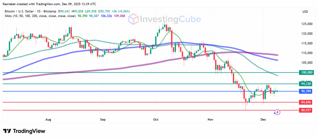 BTCUSD daily chart on December 9, 2025 with key support and resistance levels. Created on TradingView