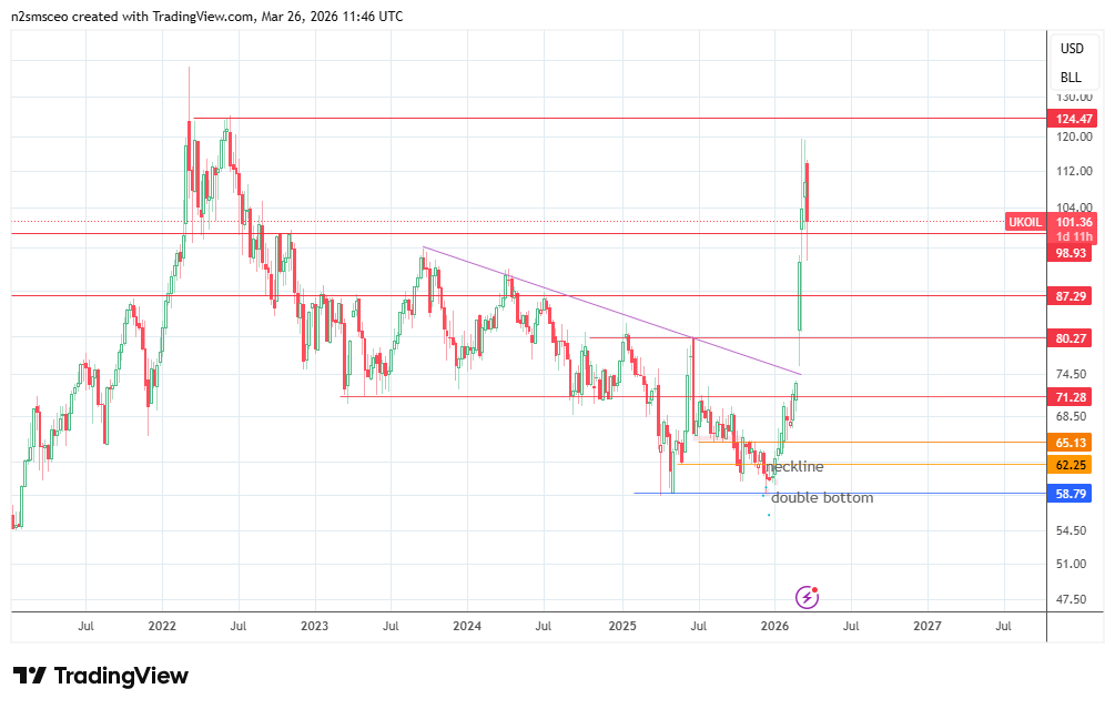 Bull case: if the situation escalates or additional information indicates the Hormuz disruption will extend into April, the Brent crude oil price could approach $110, or even higher. A severe supply loss Math boosts this prediction.