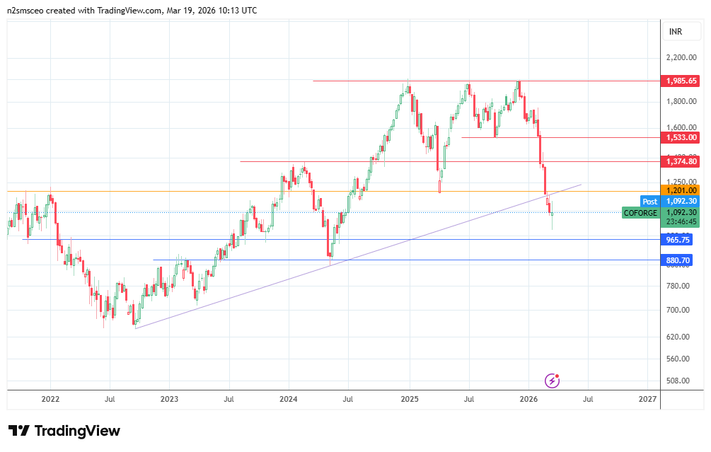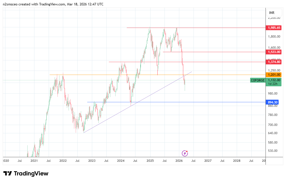 Coforge is trading within a risk-off setting for Indian IT stocks. Fears of AI disruption and the broader macro uncertainty that has beset Indian stock markets due to the ongoing conflict in the Middle East are shaping the climate in which stocks like Coforge are trading.