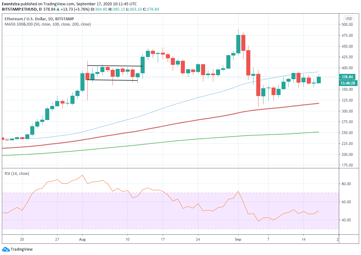 Ethereum price hovers close to two-week lows but managed today to return above the 340 mark. The number two cryptocurrency breached below the 50-day moving average in early September and since then any attempt to return above met intense selling pressure. Ethereum keeps the impressive gains since the beginning of the year it is now 166% higher, while it is 180% higher since the March lows.