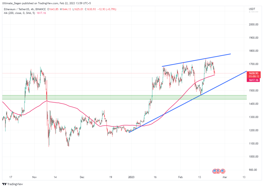 Although Ether (ETH) has rallied a lot in 2023 but the price has failed to break above $1700. This level also corresponds with the November 2022 high which ETH/USD made before FTX collapsed. On the daily chart, ETH is also making an ascending wedge pattern which can turn out to be very bearish.