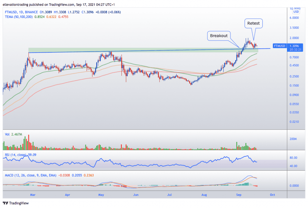 The daily chart shows a significant trend line is visible, below the price. The trend, linking the former all-time highs from February and May, is currently at $1.15 and the immediate support. After setting the $1.99 ATH, the Fantom price tracked back to the trend line. So far, the trend has held up, and FTM is currently stable at $1.30.