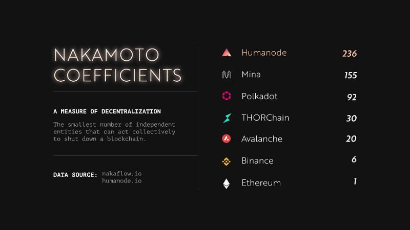 Humanode, a Layer-1 blockchain built with Polkadot SDK, has become the most decentralized blockchain network to date based on the Nakamoto Coefficient. With 706 active validator nodes, the Nakamoto Coefficient for the Humanode is 236, shooting past the prior number one, Mina, which has a Nakamoto Coefficient of 155. Polkadot now holds the 3rd place.