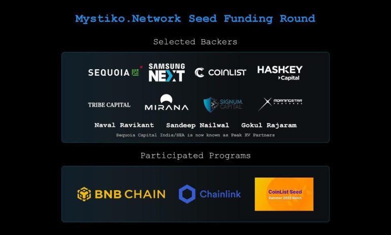 Mystiko.Network, the leading Base Layer of Web3, has completed a 18 Million USD seed funding round led by Sequoia Capital India/SEA (now known as Peak XV Partners), with participation from Samsung Next, Hashkey, Mirana, Signum, Coinlist, Naval Ravikant, Sandeep Nailwal, Gokul Rajaram, Tribe Capital, Morningstar Ventures, etc.