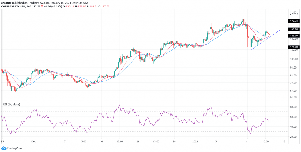 Litecoin price is under pressure today after rallying by more than 5% yesterday. LTC is down by more than 3% and is trading at $147.90, which is slightly lower than yesterday’s high of $157. Other cryptocurrencies like Bitcoin, Ethereum, and Bitcoin Cash are slightly below their highest points yesterday.