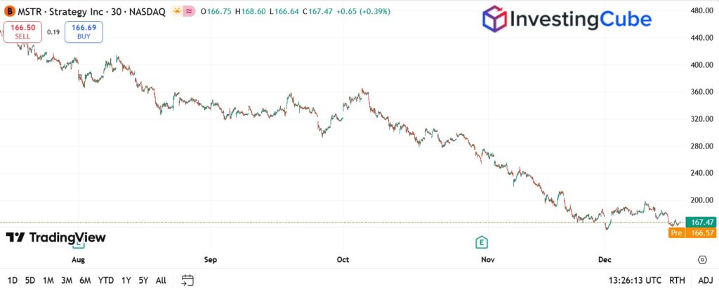 The MSTR daily chart shows Strategy shares trading around the $167 area, consolidating after a prolonged downtrend from the November highs above $300. Price action remains rangebound, with repeated failures to reclaim the $180–$200 zone, suggesting sellers still control rallies while buyers are defending a short-term base near recent lows.