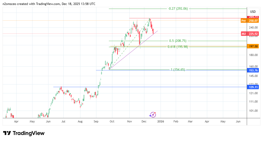 Micron is currently in a post-breakout correction, after failing to push beyond the new highs. The corrective decline from the rejection at the 264.75 all-time high is now testing the rising trendline that marks the recent lows from 25 September.