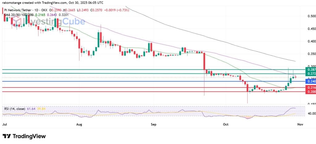 Pi is trading at $0.257, and is above the 20-day SMA at $0.216. This signals that the bulls are in charge. The $0.240 pivot is the first level of support, with the second one likely at the 20-day SMA at $0.216 and the third at the psychological $0.20 near the weekly low. Initial resistance is likely to be at at $0.272 and the second one could come at $0.287. If Pi breaks out over $0.30, it could target $0.35. RSI at 61.64 is bullish without the risk of overbought conditions.