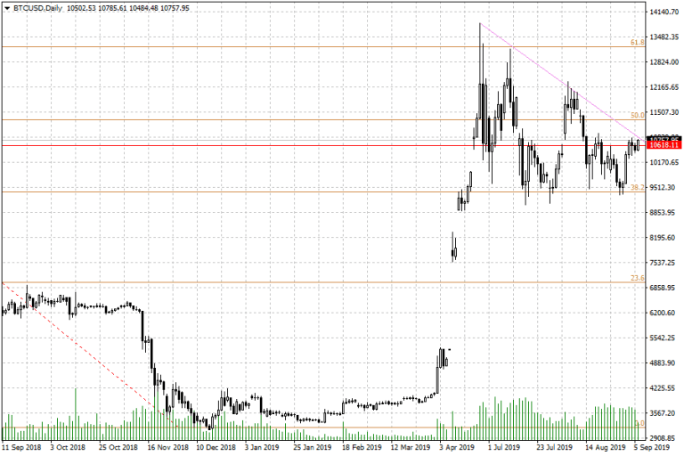 Technically speaking, failure of BTCUSD to break the 10,620 barrier decisively could open the door for a pullback to the 9400 once more (lower border of the triangle).