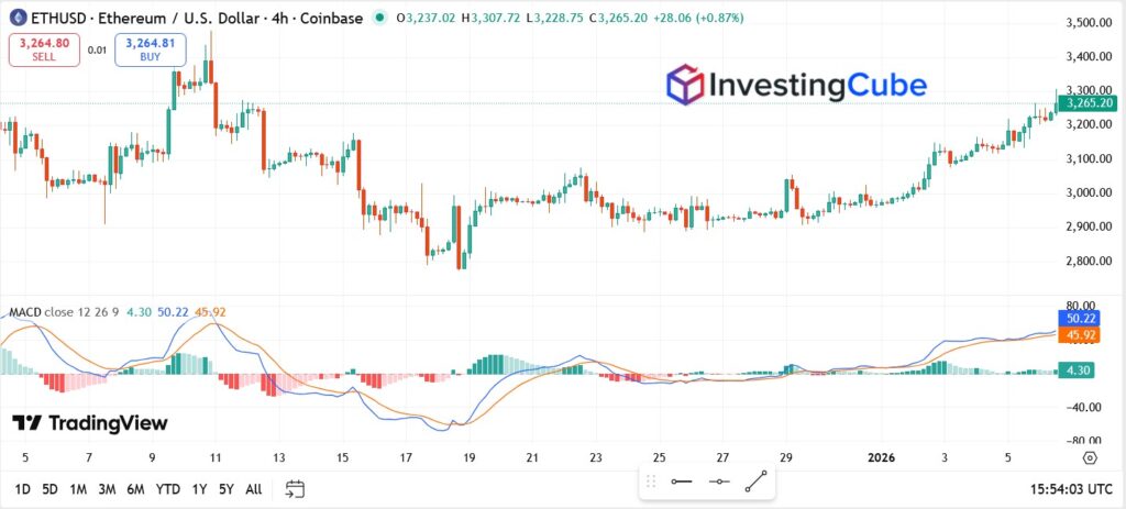 Price action on the 4-hour chart shows a steady sequence of higher lows, indicating improving structure rather than speculative spikes. While ETH has not yet broken through the $3,280 to $3,300 resistance band, buyers have consistently defended pullbacks, suggesting accumulation rather than distribution.