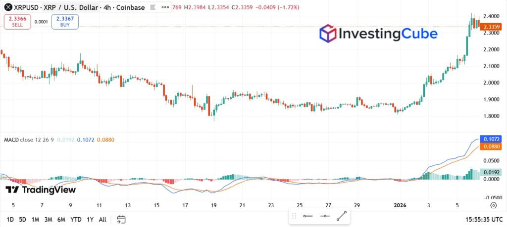 XRP is currently trading around $2.33, up roughly 30% from its late-December low near $1.85, after staging one of its strongest short-term rallies in recent months. The advance followed a prolonged period of compression, with price finally breaking above the $2.28 resistance earlier in January and triggering a sharp upside expansion.