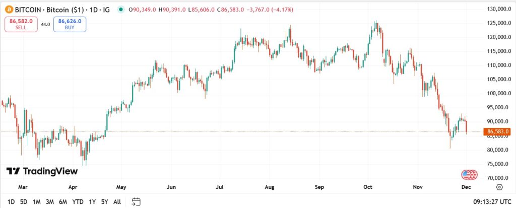 BTC/USD daily chart shows Bitcoin trading around $86,583, attempting to hold support near $85,000 – $88,000, a zone that previously attracted buyers in April and August. The RSI is deepening toward oversold conditions, showing selling pressure may be fading, but momentum remains fragile.
