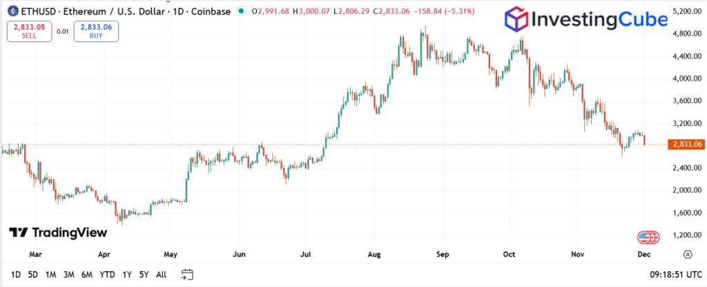 ETH/USD is trading at $2,833, sitting just above support at $2,800 – $2,850. This zone acted as a reaction point in September and November.