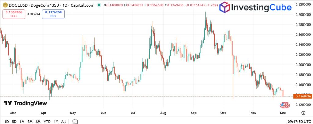 DOGE/USD daily chart shows price hovering around $0.136, after breaking below $0.15 support, a level that previously acted as a base for mid-year rallies.