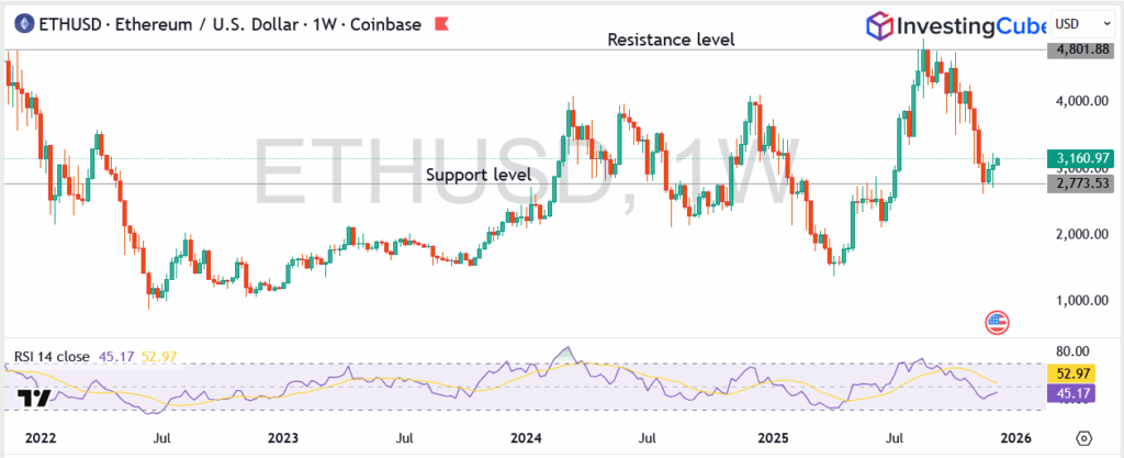 Ethereum is showing a steadier structure than BTC, trading around 3,160, after reclaiming its major 2,770 support zone. The weekly RSI near 53 suggests improving momentum, hinting that buyers are cautiously returning after November’s broad market pullback.