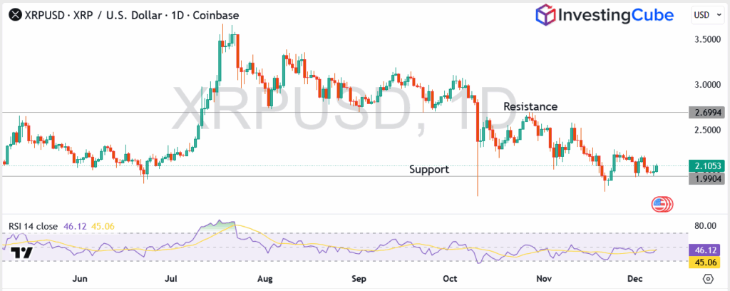 XRP trading around 2.10 dollars, hovering just above the 1.99 dollar support level that has repeatedly kept the downside in check. For now, the structure stays neutral, with the first resistance zone near 2.70 dollars, which capped every rebound attempt through November.