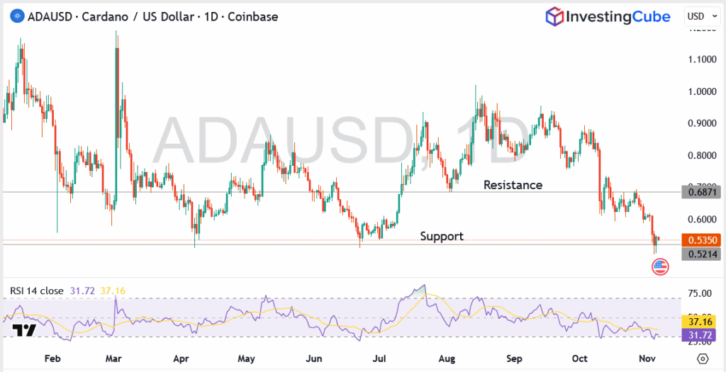 ADA/USD faces resistance at $0.68 – $0.70 and support at $0.52 – $0.50. The RSI (14) near 31 shows oversold conditions, while the ADX at 33 hints at trend weakening. A rebound above $0.60 would validate early bullish divergence. Failure to defend $0.50 could open the door to $0.45 before buyers return.
