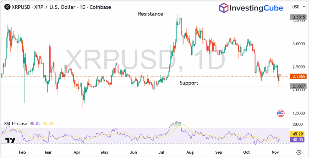 XRP trades near $2.30, up roughly 3 percent in 24 hours. Intraday moves briefly tested $2.38, with support now seen at $2.08 and resistance at $2.40 – $2.44, aligning with the 38.2 percent Fibonacci retracement of the September-October range.
