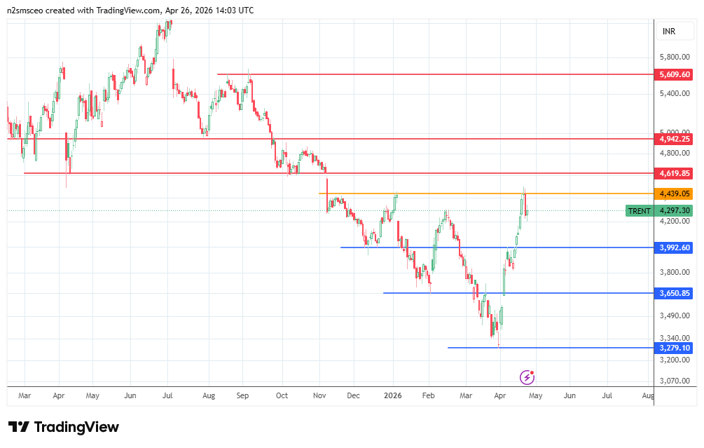1. Strong Q4 performance: Trent Limited posted a Q4 profit growth of 26%, and issued its first maiden bonus. The company also reported a 19.2% revenue growth toto ₹5,027.99 crore, driven by expansion (23 Westside, 109 Zudio stores). This could taper the stock’s decline once traders come out of worries about the proposed funding plan.