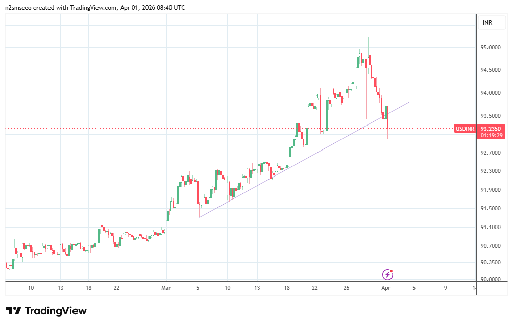 According to the live market charts, the USD/INR is trading at 93.27 currently, as the Rupee clawed back gains after dropping to record lows at 95.22 on 30 March versus the US Dollar. The reason for the deep pullback in the pair may not be unconnected to RBI interventionist measures.