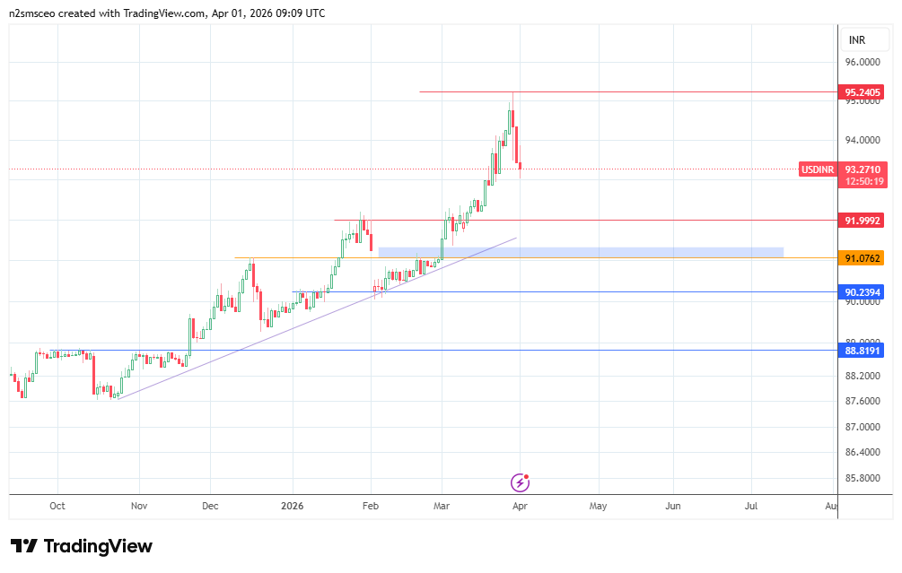 USD/INR is trading in a broader bullish structure but has retreated after failing to sustain gains above 95.00. The pullback is more of a corrective move and not a bearish reversal. The price continues to trade above the previous breakout zone and lies above the trendline that supported the advance in Jan-Mar 2026.