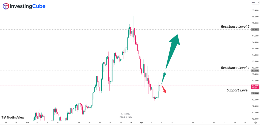 The most probable near-term outcome is a corrective range of 92.80 and 93.60 as the market waits for RBI decision and keep close eye on crude oil. A persistent break under a 92.80 would indicate that the correction is deepening, potentially paving the way for a more prominent unwind of the late-March rally. However, if support holds and oil or geopolitical pressures escalate once more, USD/INR could build upside momentum again and also retest 94.80 (previous highs) to 95.20.
