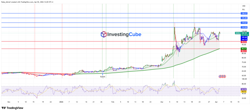Conversely, if the price fails to breach the $109.46, a “Double Top” pattern could begin to form, suggesting buyers losing momentum. A loss of momentum would likely see the RSI trend downward toward the 50 level. In this case, if the oil price falls toward the red support line at $104.15 without holding, a deeper correction would happen toward $98.56.