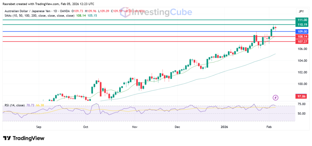 The AUD/JPY pair, often seen as a gauge of global risk sentiment, has been trending upward since April 2025. It has climbed from around 86.14 to nearly 109.74. So far this year, the pair is up over 4.96%, even with slower commodity demand like oil, warnings of an AI bubble, and strong safe-haven demand for gold, which has jumped over 70% since last year.